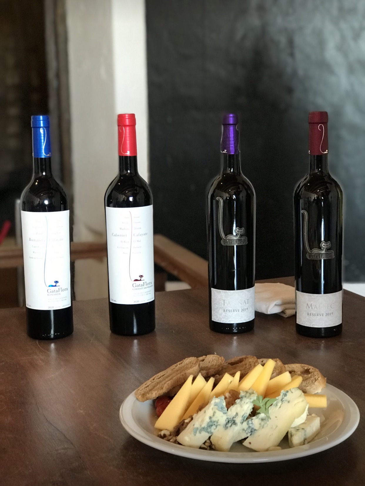 La tercera parada del día sería al cruzar la calle. Caminando nos sorprendió la antigua y conocida Bodega Vasija Secreta. Hicimos una visita guiada por la enóloga de la bodega, donde probamos vinos Gata Flora. Eligió para nosotras un Bonarda 2020, un Cabernet Sauvignon, 2020, un Tannat Reserve, 2019 y un Malbec Reserve, 2019. Una delicia y decidimos almorzar la comida típica salteña en una galería con vista a los viñedos.